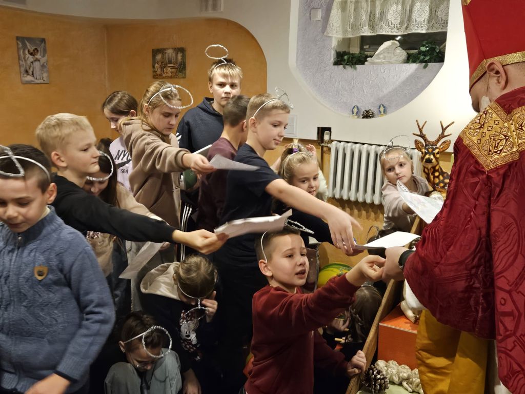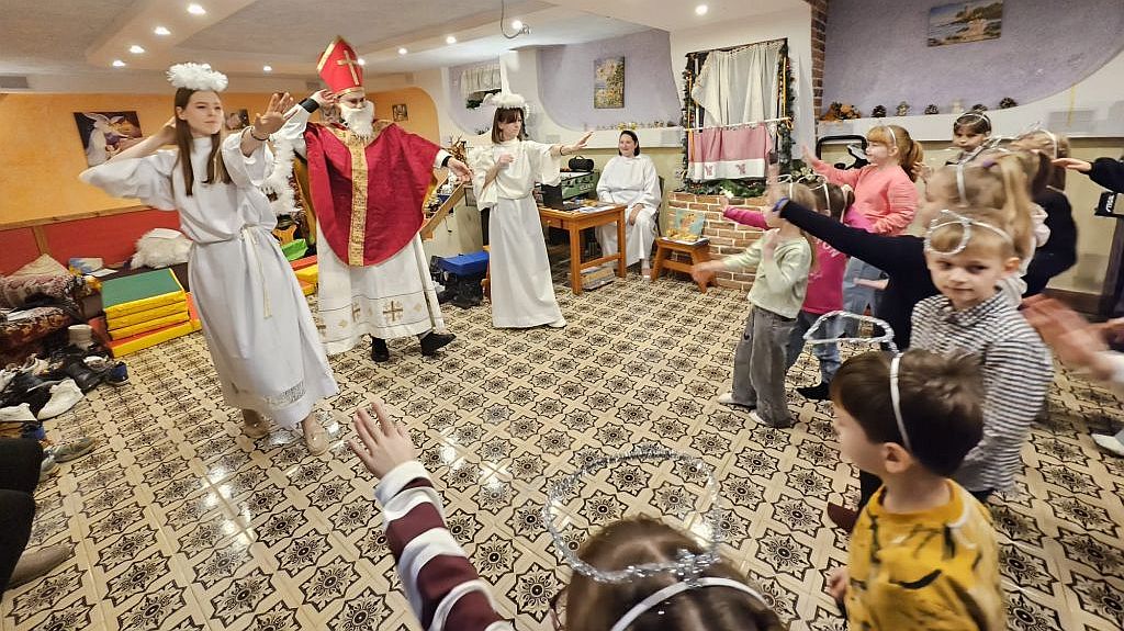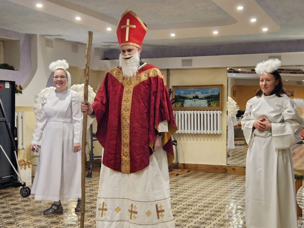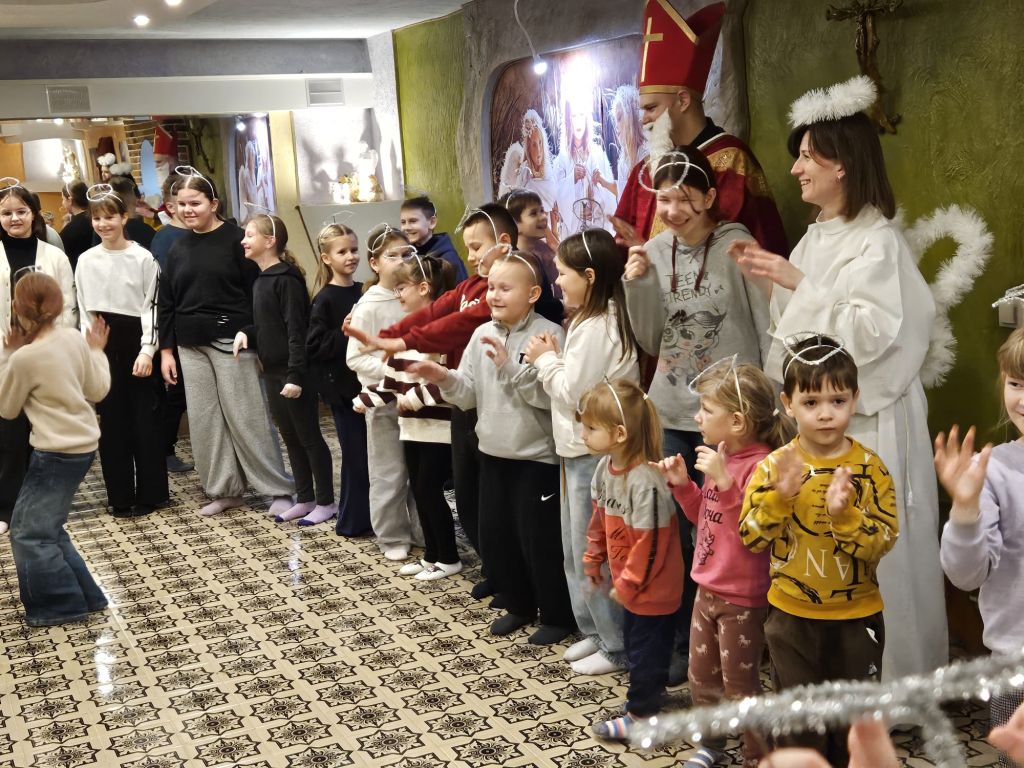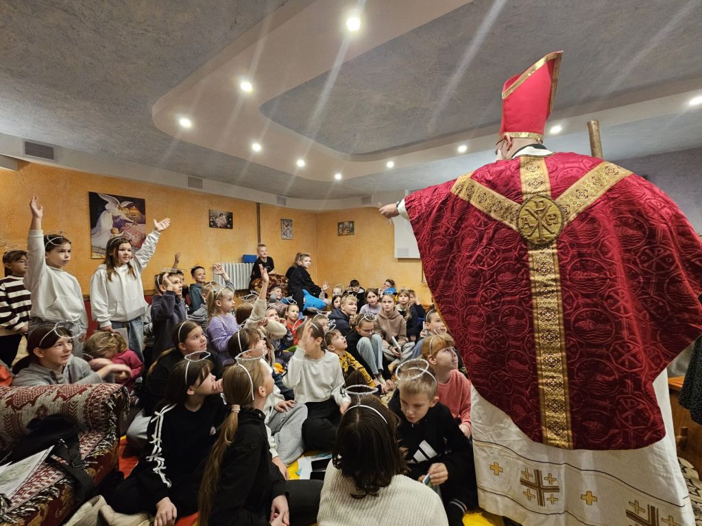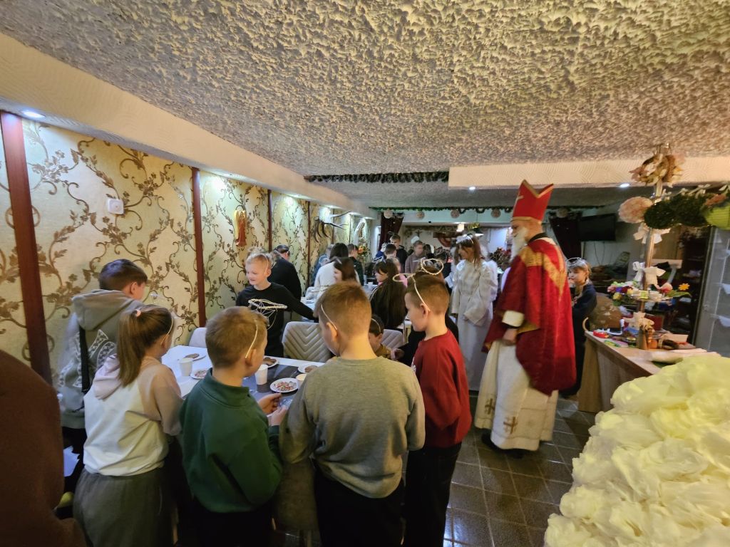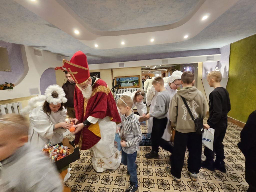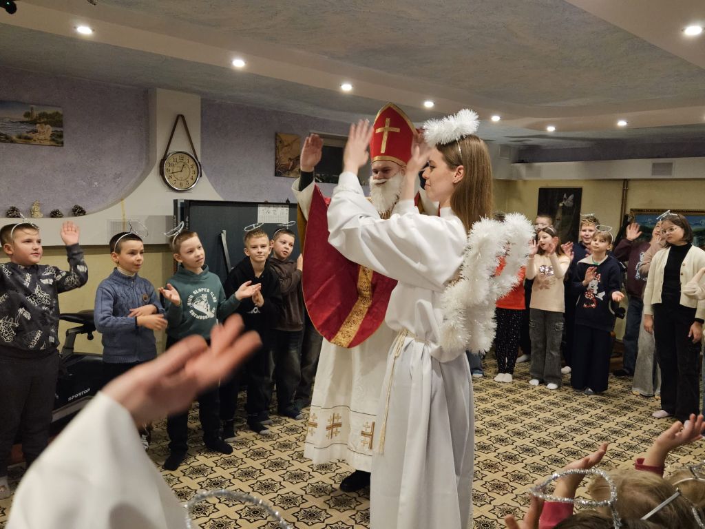Der heilige Nikolaus im Kinderfreizeitraum in Szydłowicze, Belarus, am 6. Dezember 2025